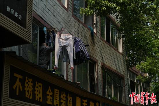 封城期间,一位社区居民直接将衣服晾晒在窗外的绳子上。