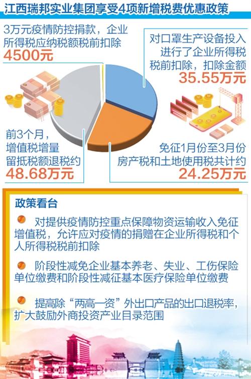 “新冠肺炎疫情防控期间,企业面临较大资金压力。税收减免政策的落地,一下子给我们优惠了100余万元的税费,无异于雪中送炭。”4月19日,江西瑞邦实业集团有限公司负责人付国强告诉记者,优惠政策给企业减轻了负担、增强了动力。