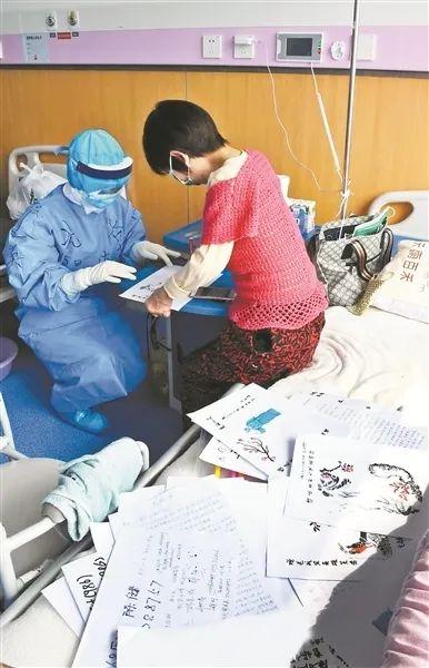 在湖北省妇幼保健院光谷院区病房,被军队医护人员从死亡线上拉回来的陈女士,给救治她的每名医护人员画了一幅画、写了一段祝福语,表达感激之情。王传顺摄