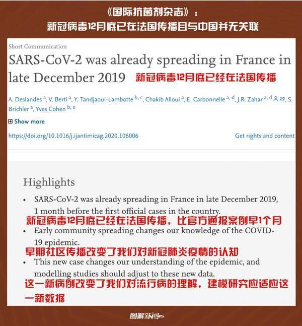 2020年5月3日,《国际抗菌剂杂志》网站刊发了法国巴黎东北郊塞纳-圣但尼医院集团主持撰写的研究论文。研究指出,一名在2019年12月底被当作流感患者的病例具有新冠肺炎症状,该患者并没有武汉旅行史和接触史。这表明,新冠病毒已于2019年12月下旬在法国传播且与中国并无关联。 人民网供图 王政淇/制图