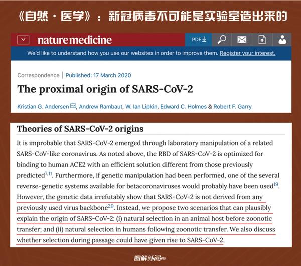 2020年3月17日,《自然·医学》杂志刊发美国、英国、澳大利亚5位权威科学家的研究论文证明,新冠病毒不可能是实验室造出来的,可能是病毒对人或动物宿主的自然选择。 人民网供图 王政淇/制图