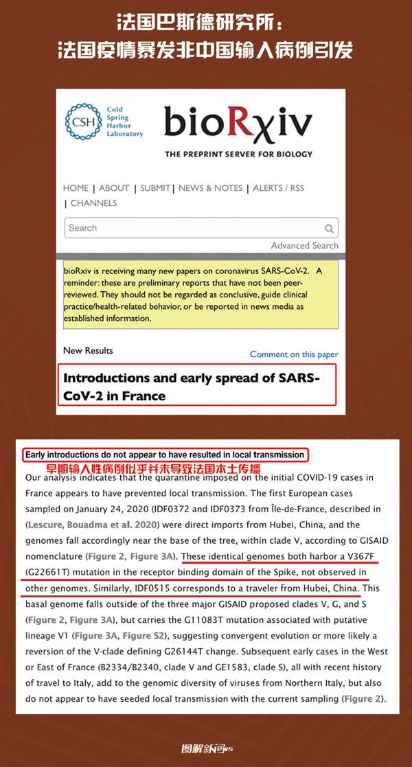 2020年4月29日,法国巴斯德研究所在其网站上预发表的一篇论文,将法国检测到的97个新冠病毒样本与全球共享流感数据倡议组织(GISAID)发布的338份新冠病毒序列进行比对和溯源分析。研究发现,法国流行的新冠病毒和1月发现的中国输入病例感染的病毒并非来自同一毒株。这说明,导致法国本地疫情暴发的病毒并非来自中国。 人民网供图 王政淇/制图