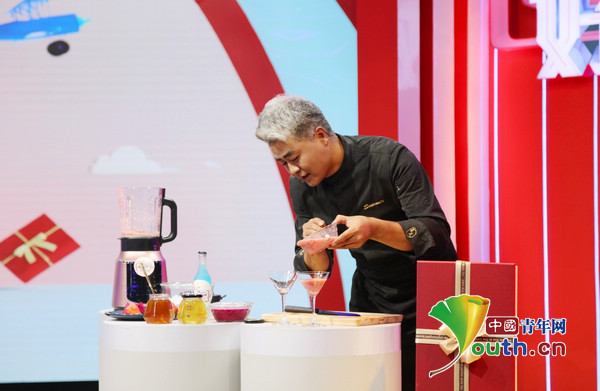 注册中国烹饪大师夏天、共青团中央“青年讲师团”成员秦梓茜,新生代演员崔莉雅作为助力团成员分别就三种产品进行“好物100秒”的晒货表演。暖厨夏天在本轮推介的是石楼枣花蜜和槐花蜜。一展厨艺之前,夏天首先开启厨师课堂,教大家辨别蜂蜜好坏小技巧。之后,他更用两款蜂蜜配合火龙果、猕猴桃、草莓与预调鸡尾酒调制高颜值夏日缤纷石楼蜜香鸡尾酒果泥,创意无限。孟利书记品尝过后连连夸赞其时尚浪漫,色香味俱全。
