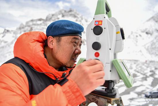 5月27日,2020珠峰高程测量登山队成功登顶后,在珠峰大本营的珠峰高程起算点,自然资源部第一大地测量队队员利用全站仪等仪器对珠穆朗玛峰峰顶进行交会观测。新华社记者 孙非/摄