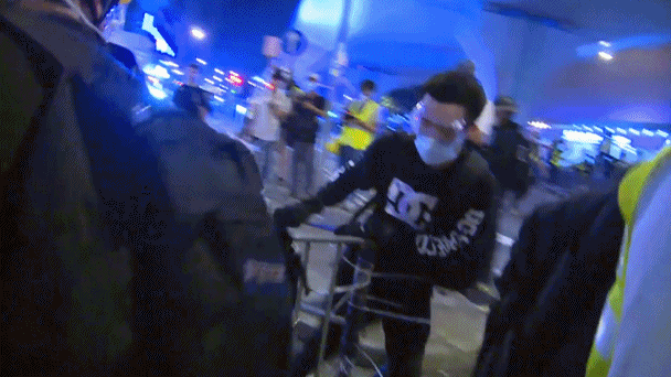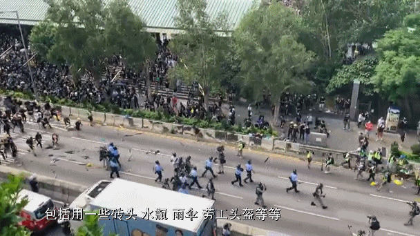 (时任)香港东九龙冲锋队高级督察 黄家伦: 当我和我的队员到现场的时候,我们看到,马路上有六七十名暴力示威者,利用铁栏、垃圾桶以及一些杂物去堵塞车路,我们就进行了驱散行动,当时暴力示威者用一些硬物扔我们警察,包括砖头,水瓶,雨伞,头盔等等。