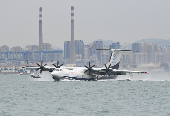 约9时28分,AG600飞机从山东日照山字河机场起飞,飞行约28分钟后抵达青岛团岛附近海域。10时14分,飞机轻盈入水,平稳地贴着海面滑行,回转、调整方向、加速、机头昂起……10时18分,宛如一条东方巨龙,迎浪腾空直插云霄。在安全飞行约31分钟、完成一系列既定试飞科目后,AG600飞机于10时49分顺利返回日照。