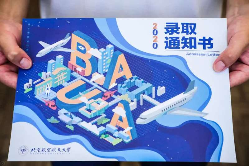 今年北航的本科生录取通知书由该校新媒体艺术与设计学院学生自主设计,将BUAA(注:Beijing University of Aeronautics and Astronautic的缩写)与北航校园建筑融合,并加入了飞机与航概妹等北航特色元素,简单又不失趣味。