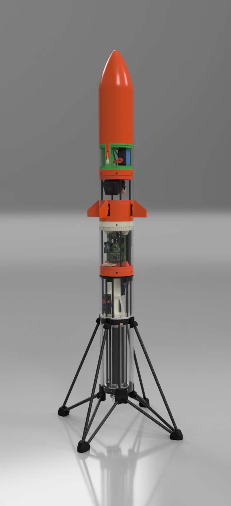 “推力矢量控制(TVC)”“姿态控制”“模块化设计”“可重复使用”……这些都是这枚火箭的“牛”处所在。火箭搭载了刘上自制的TVC发动机。发动机的喷口可以向不同方向偏转,只要稍稍改变方向,就可以保证火箭笔直升空。这枚TVC发动机是刘上此次最满意的设计之一,在民间火箭爱好者的圈子里也是一个不小的突破。此外,发动机使用“c型”燃料内孔,推力平稳;自带起落架,无需发射架辅助便能起飞。