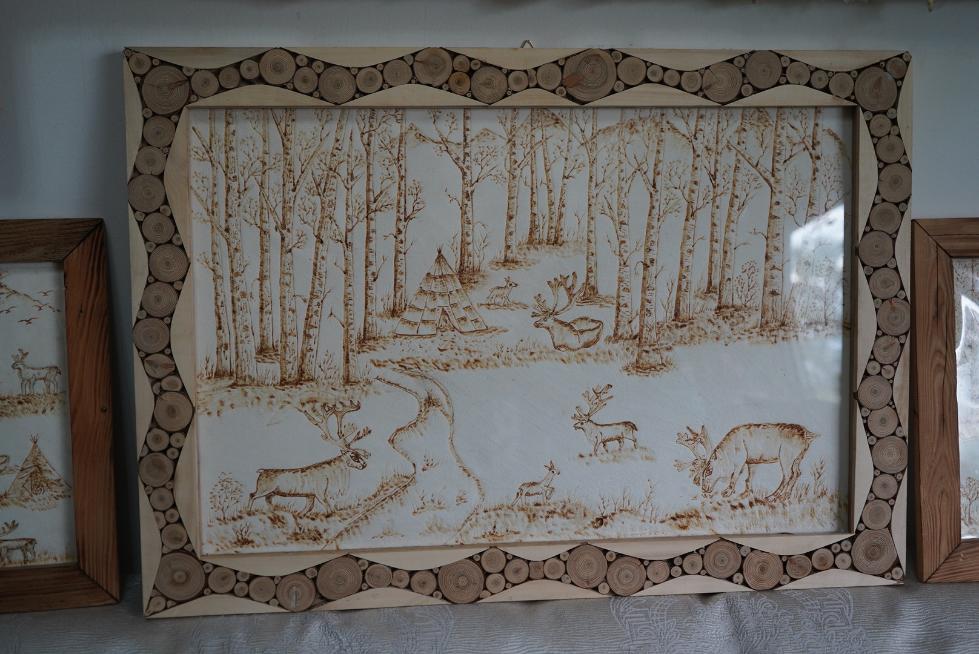 走进她家,满墙的桦树皮画精美传神,再现鄂温克族人与驯鹿的生活场景,让人难以相信这些都是出自从未学过画画的张国凤之手。这些桦树皮画不仅能售卖,还将整间民宿装饰得“熠熠生辉”,张国凤也自豪地说:“我家应该是敖乡最漂亮的了!”