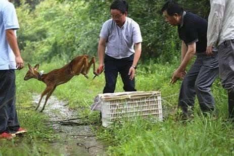 2020年7月28日,工作人员放归国家二级重点保护野生动物獐。图片来源:江苏省林业局