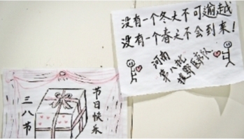 昨日,武汉江汉方舱医院正式拆除,走廊上感谢医护人员的信和漫画随处可见。 长江日报记者任勇 摄