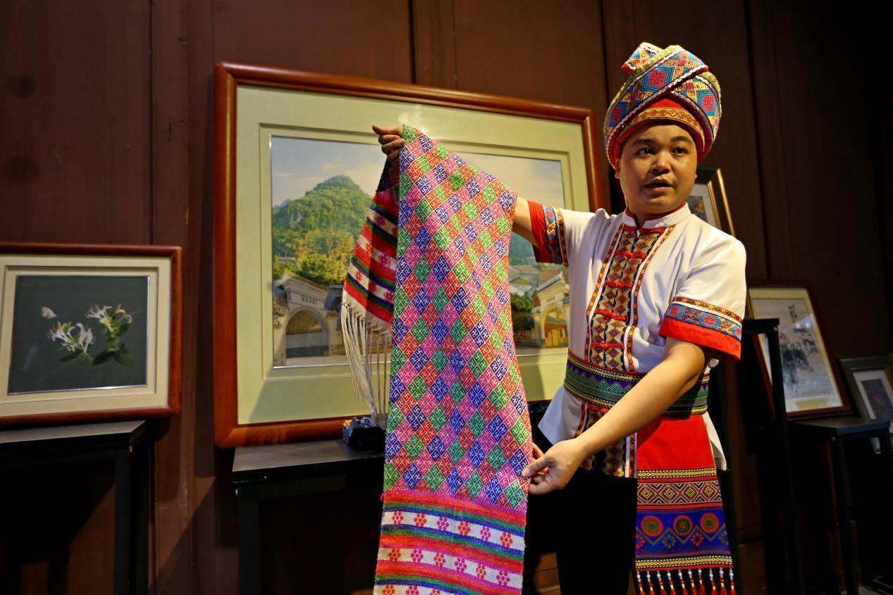 壮锦技艺生产性保护示范基地负责人蓝培文介绍壮锦。严立政摄
