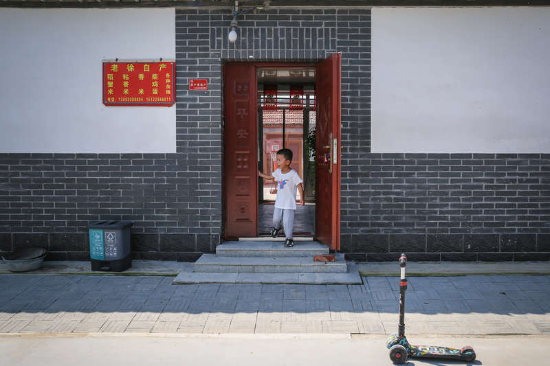 8月21日,天津市宝坻区黄庄镇小辛码头村,一名儿童走出家门,门口悬挂了自家的土特产广告。目前,村子主要发展旅游业,100户居民中有40多户都做起了生意。其他人也从事着与乡村旅游相关的工作,有的为村里做绿化服务,有的在农家院打工,有的在街上卖土特产。2019年,该村的人均可支配收入达到3.2万元。中青报·中青网见习记者 张玉佳/摄