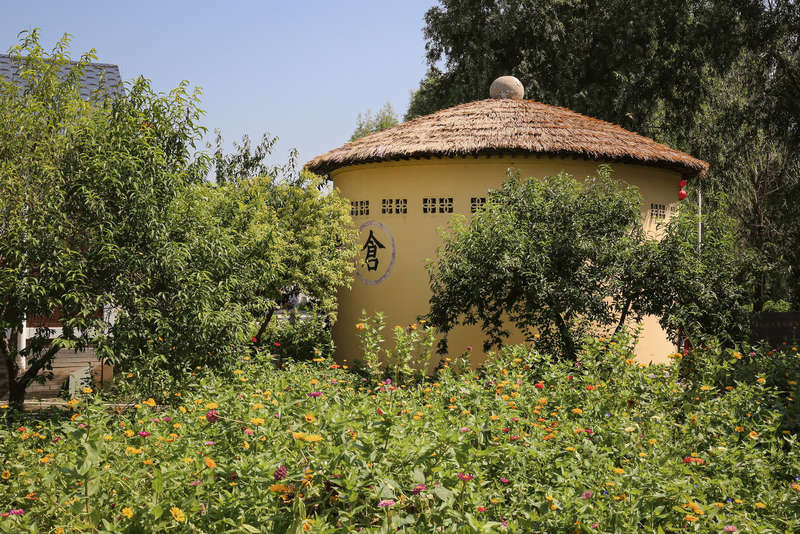8月21日,天津市宝坻区黄庄镇小辛码头村,了凡广场上一座印有“仓”字的建筑。了凡广场的建设是为了纪念历史上的宝坻知县袁黄(袁了凡)。明朝万历年间,时任宝坻知县袁黄(袁了凡)在这里南稻北种,教化乡民,开启了北方地区种植水稻的先河。中青报·中青网见习记者 张玉佳/摄