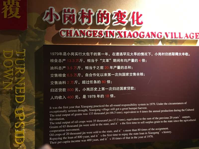 纪念馆墙上的一组数据显示:从1966年到1976年,小岗村人口有100人左右,每年人均口粮仅有200斤左右,要吃国家的供应粮。1979年,实行大包干的第一年,小岗村就取得了丰收,粮食总产量是之前平均水平的4倍。