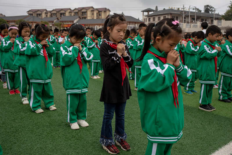 9月8日,贵州省毕节市纳雍县天河实验学校,上午的课间操,学生们在歌曲《感恩的心》播放结束时,做祈祷的动作。中青报?中青网记者 李隽辉/摄