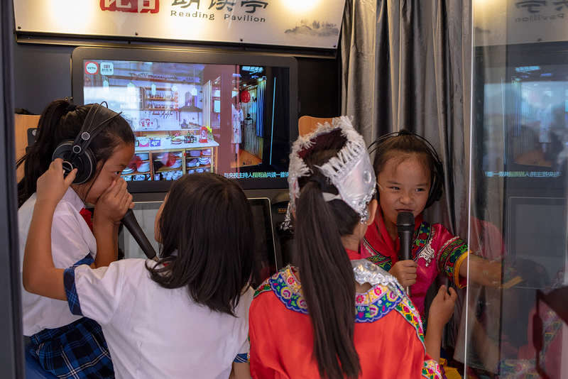 9月8日,贵州省毕节市纳雍县天河实验学校,朗读亭里,学生们可以跟着标准的普通话学习朗读。中青报?中青网记者 李隽辉/摄