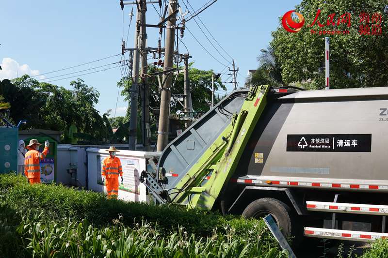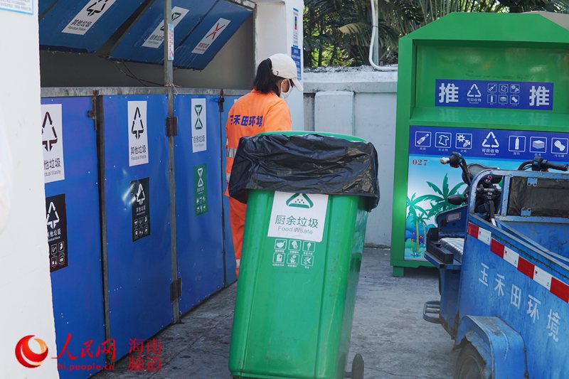 “每天环卫工作人员都会来清理厨余垃圾和其他垃圾,分类运走,可回收垃圾和有害垃圾因为量较少,两三天清理一次。” 海口玉禾田环境服务有限公司副总经理张建伟介绍,为防止垃圾收集后混在一起,会在不同时段采用不同垃圾车转运。