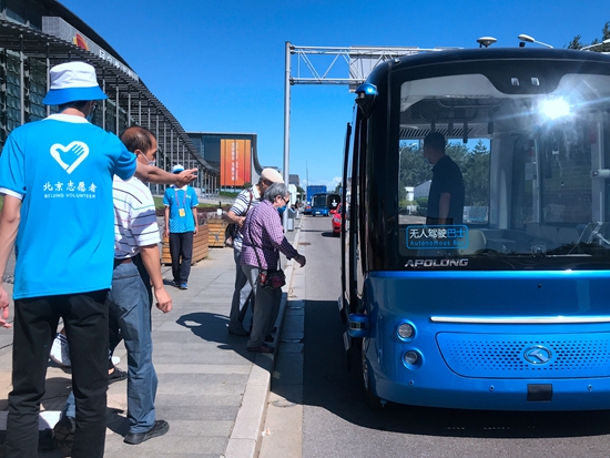 在服贸会现场,观众正排队上车体验无人驾驶巴士。