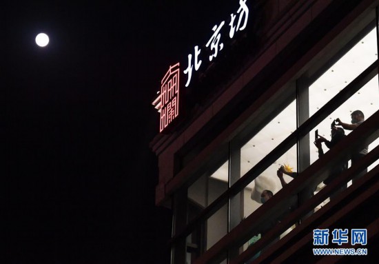 10月1日,几位游客驻足在北京坊的建筑内拍摄夜景。 当日是农历八月十五,传统的中秋节与国庆节相遇,共迎圆月。 新华社记者 李贺 摄