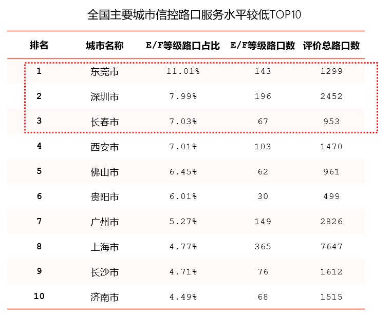 红绿灯路口服务水平较低十大城市:东莞、深圳、长春排名前三
