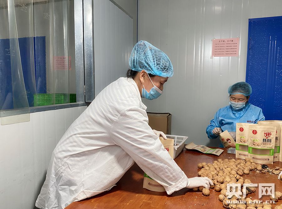 像陈增峰一样来工厂打工的村民并不少,李粉利也是其中的受益人之一,有些腼腆的她告诉记者,之前因为公公婆婆生病变成了贫困户,现在来到公司给核桃加工产品做外包装,一个月可以赚到2000块,基本满足家庭开支。