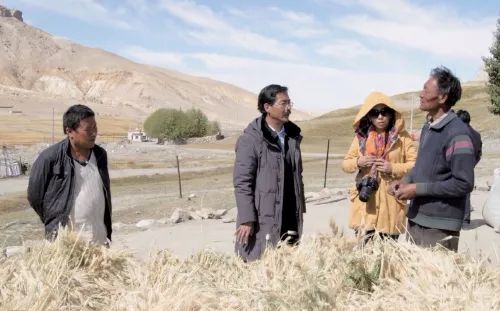 尼玛扎西(左二)在阿里地区札达县调研青稞种植情况。资料图