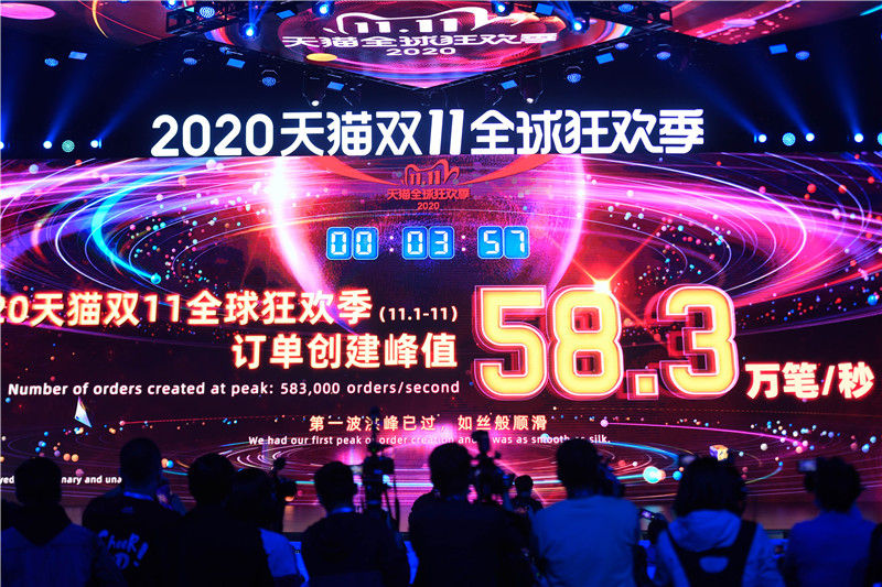 11月11日凌晨,浙江杭州未来科技城学术交流中心,大屏幕显示阿里巴巴旗下天猫“双11”订单创建峰值达58.3万笔/秒。新华社记者 黄宗治 摄