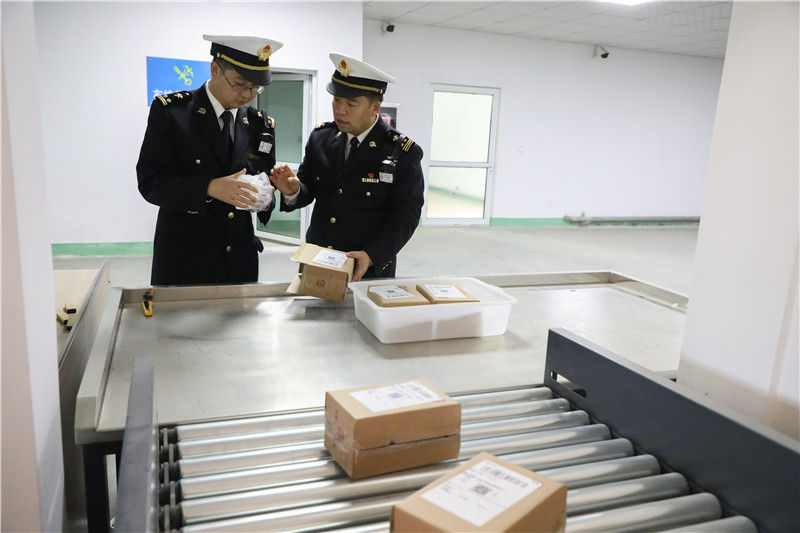 11月11日,在兰州新区综合保税区跨境电商监管中心,海关工作人员在检查货品。新华社记者 马希平 摄