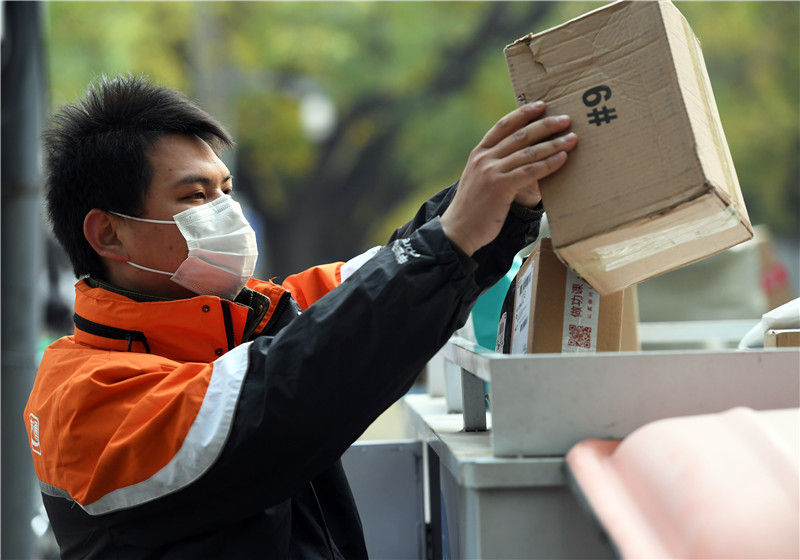 11月11日,在申通快递北京大学南门快递点,快递员董鹏飞在摆放快递包裹。新华社记者 任超 摄