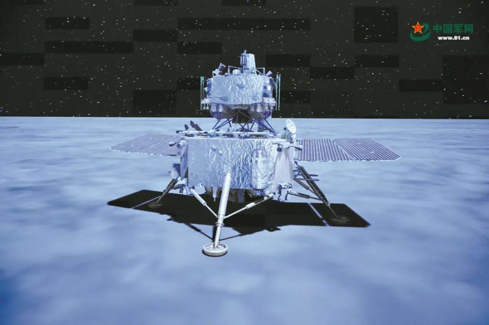 12月1日23时11分,嫦娥五号探测器成功着陆在月球正面西经51.8度、北纬43.1度附近的预选着陆区,并传回着陆影像图。