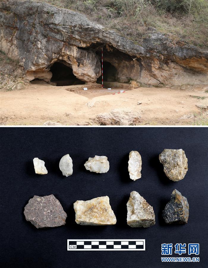 陕西南郑疥疙洞旧石器时代洞穴遗址近景(上图)、疥疙洞遗址出土的石制品(下图)(拼板资料照片)。新华社发(中国文物报社供图)