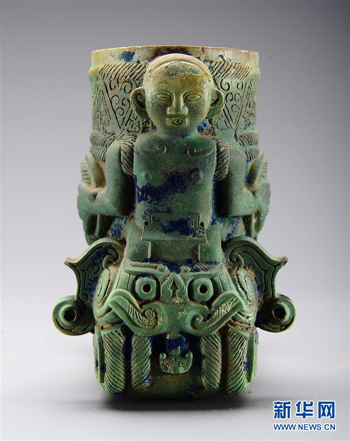湖北随州枣树林春秋曾国贵族墓地车坑出土的神人驭龙双通车构件(资料照片)。新华社发(中国文物报社供图)