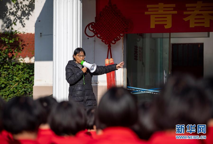 张桂梅在课间操前向学生反馈卫生、上课等检查情况(12月1日摄)。新华社发(陈欣波 摄)