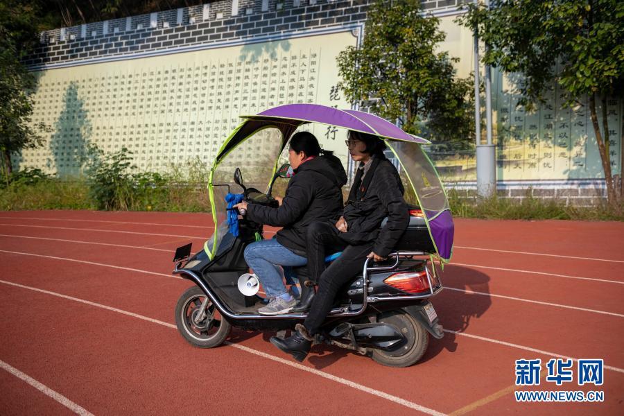 因为腿脚不便,张桂梅(后)坐车从田径场回教学楼(11月30日摄)。新华社发(陈欣波 摄)