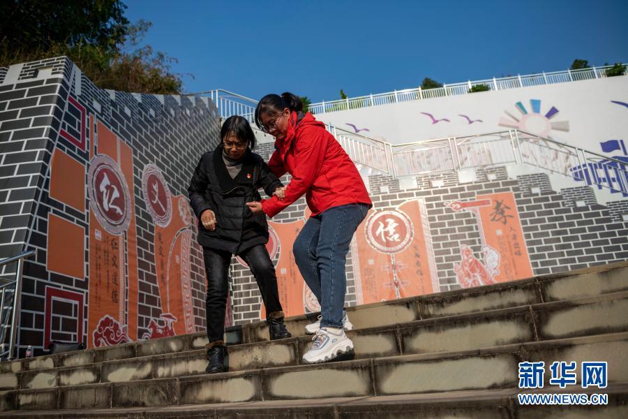 一名老师搀扶张桂梅(左)下台阶(11月30日摄)。新华社发(陈欣波 摄)