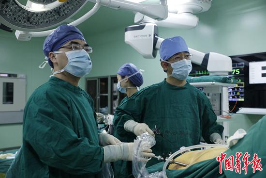 孟化(右一)在做切胃手术。