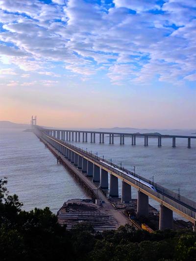 2020年12月26日,福平铁路开通运营。一列动车行驶在中国首座公铁两用跨海大桥——平潭海峡公铁大桥上。胡国林/摄