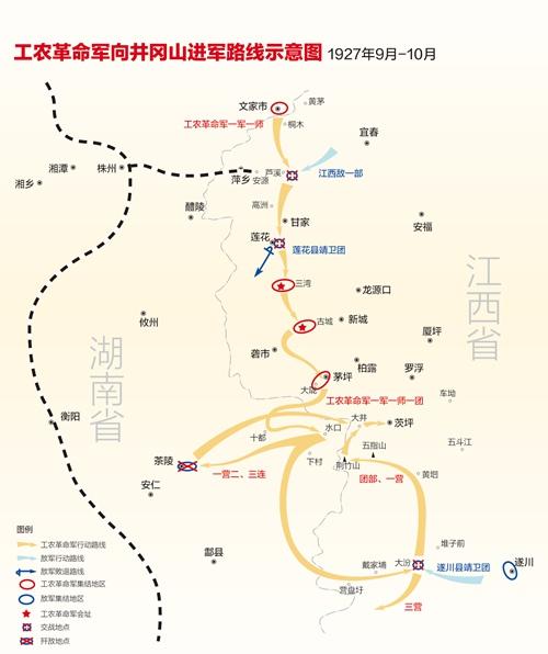1927年9月,秋收起义后,毛泽东选择放弃攻打大城市,转向湘赣边界的农村,10月27日,红旗插上井冈山,建立了第一个农村革命根据地。