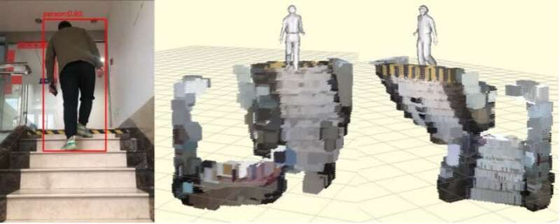 不过,四足机器人运动方式灵活,机身起伏振动剧烈,高动态环境会使视觉传感系统成像效果大打折扣。研制团队依托自主可控深度学习算法、智能芯片等关键技术,提出一种结合双目相机、惯性测量单元等多种传感器的低成本多模融合智能感知系统方案,可以在机身剧烈起伏振动的高动态环境下,实现自主定位与三维语义地图构建功能,构图实时性达每秒20帧,地图分辨率精度达到厘米级。