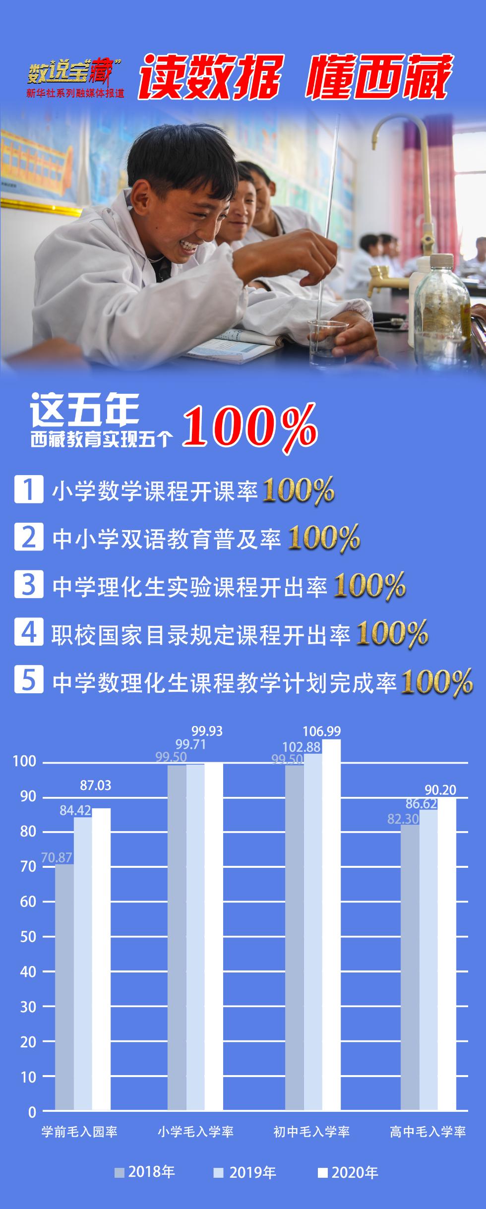 西藏自治区教育厅公布的数据显示:“十三五”时期,西藏教育“五个100%”全面实现,即中小学双语教育普及率100%,小学数学课程开课率100%,中学数理化生课程教学计划完成率100%,中学理化生实验课程开出率100%,职业技术学校国家目录规定课程开出率100%。