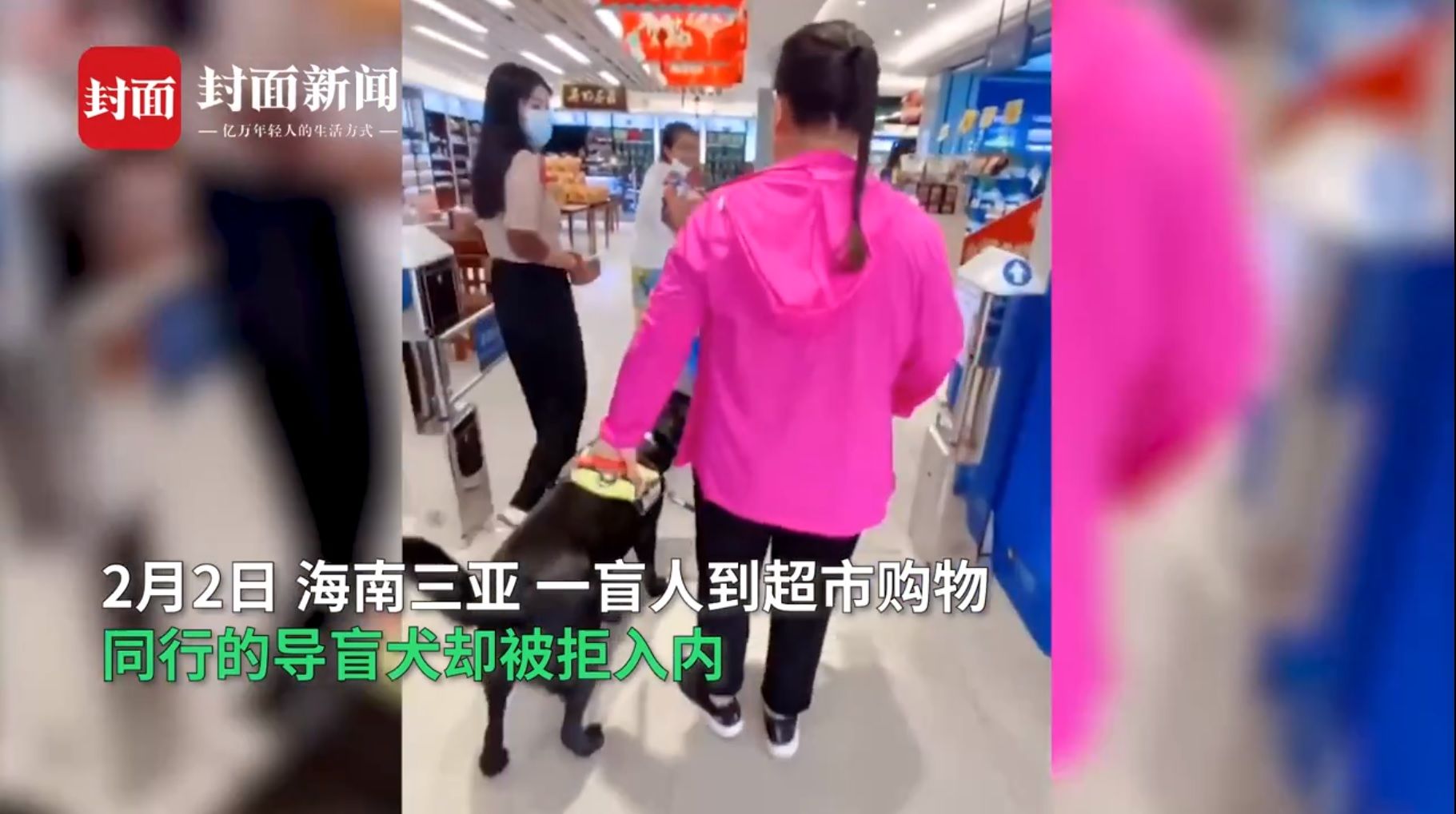 2月2日,海南三亚,一名盲人爆料称:自己携导盲犬去超市购物,却被超市以“宠物不能进入”为由拒之门外。盲人顾客表示:他出示了相关证件,但超市依然因为“有顾客投诉”而不愿让其入内。对此,涉事超市通过采访回应称:超市明确规定不让宠物进入,但并未在第一时间阻止导盲犬入内,因为有老人投诉表示受到了惊吓,才想再与盲人顾客“协商”。超市方面还表示:他们最终基于“特殊情况特殊处理”的考虑,对当事盲人和她的导盲犬放了行。