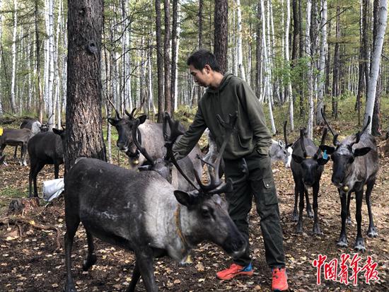 古木森侧身抚摸着驯鹿,驯鹿则亲昵地在他身上蹭来蹭去。古木森指着这头驯鹿说:“我管它叫小女朋友,因为它从小就爱跟着我。”