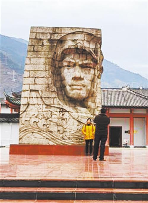 在四川石棉县安顺场中国工农红军强渡大渡河纪念馆前的广场上,两位游客在与红军强渡大渡河纪念碑合影。