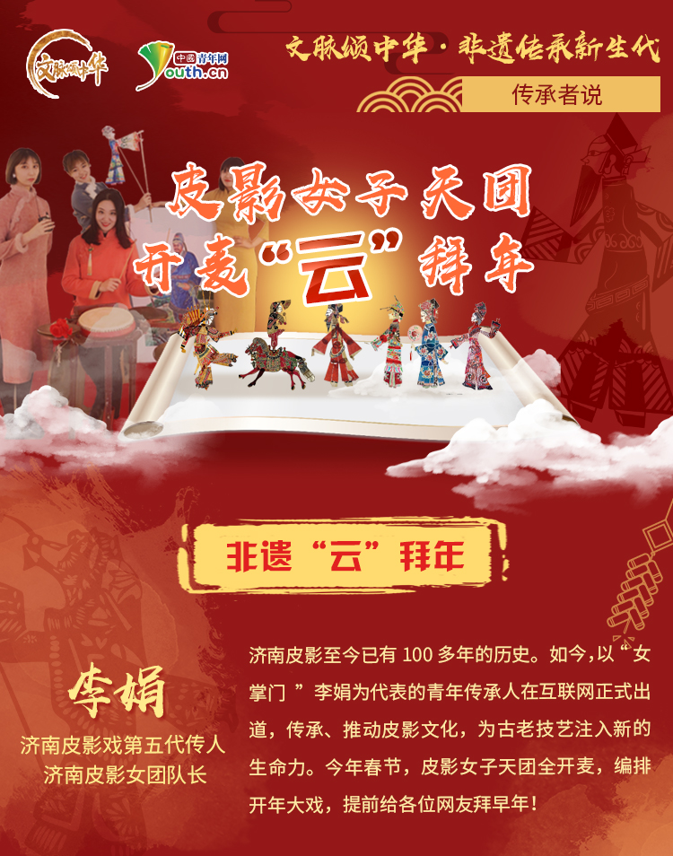 济南皮影是国家级非物质文化遗产,至今已有100多年的历史。以济南皮影戏第五代传人李娟为代表的青年传承人在互联网正式出道,传承、推动皮影文化,为古老技艺注入新的生命力。