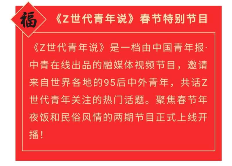 品尝了独具特色的年夜饭,twins姐妹和主持人通过《Z世代青年说》,祝大家新春快乐,牛年大吉!(中青在线见习记者许怡)