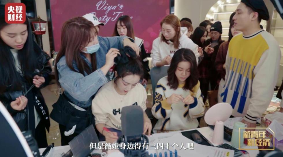 开播前10分钟,不大的直播间里挤满了几十号工作人员,他们围在薇娅身边,为直播做最后的准备。