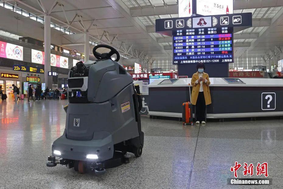 资料图:无人机器人在铁路上海虹桥站内一边保洁、一边进行消毒作业。殷立勤 摄