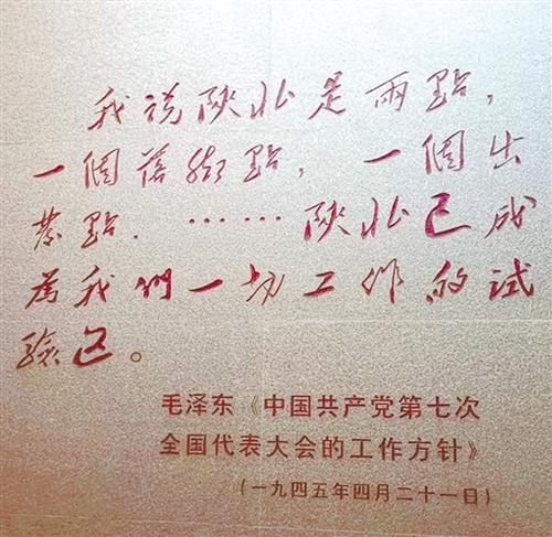 在党的七大旧址,墙上镌刻着的毛泽东《中国共产党第七次全国代表大会的工作方针》中的一句话。经济日报-中国经济网记者 张 毅摄