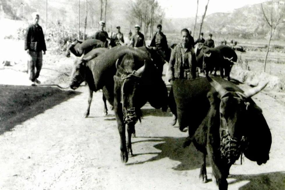 1943年,延安农民交公粮支援抗战,人们在乡间土路上用驴驮运粮食。新华社 图